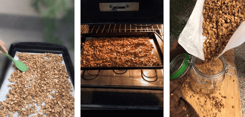 Third, Put all the mixture on a parchment paper and leave in the oven to cook for about 10 -20 minutes or until brown. If you want you can mix the oats after 10 minutes and then let it cook for another 10 min. When ready, let them cool down and put in a glass jar.